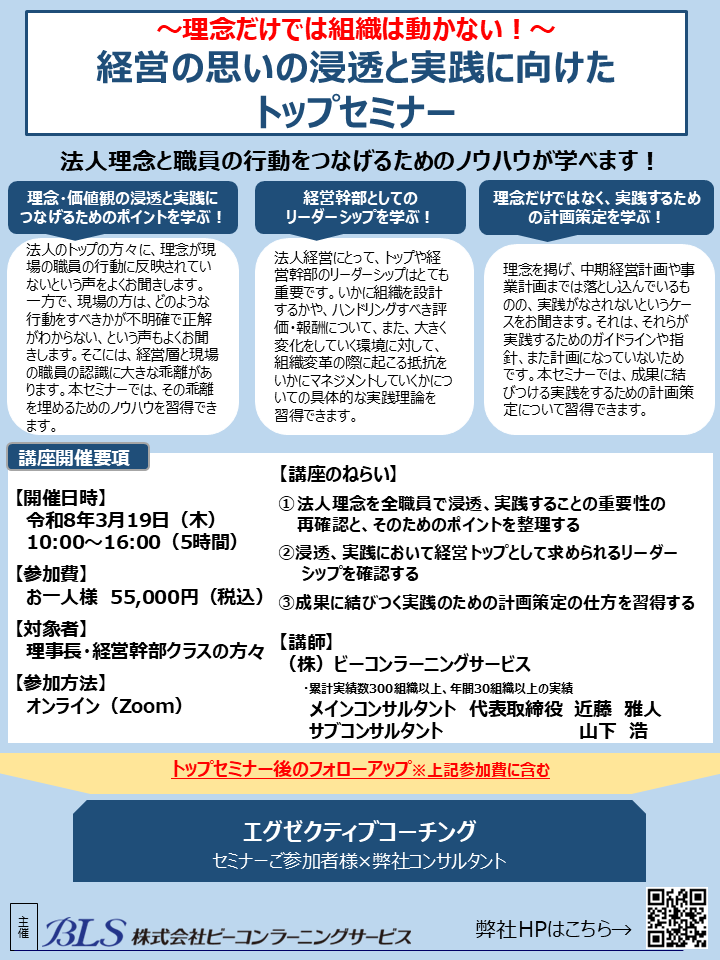 【医療・福祉組織対象】 令和8年3月19日(木)実施 経営の思いの浸透と実践に向けたトップセミナー