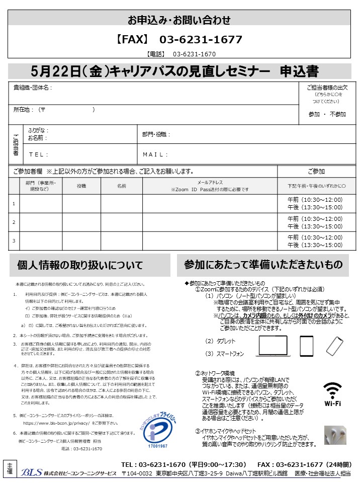 【お申込み】電話:03-6231-1670 Mail:info@bls-bcon.jp 事務局:福祉担当まで